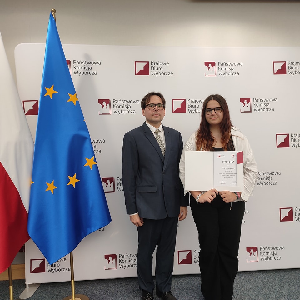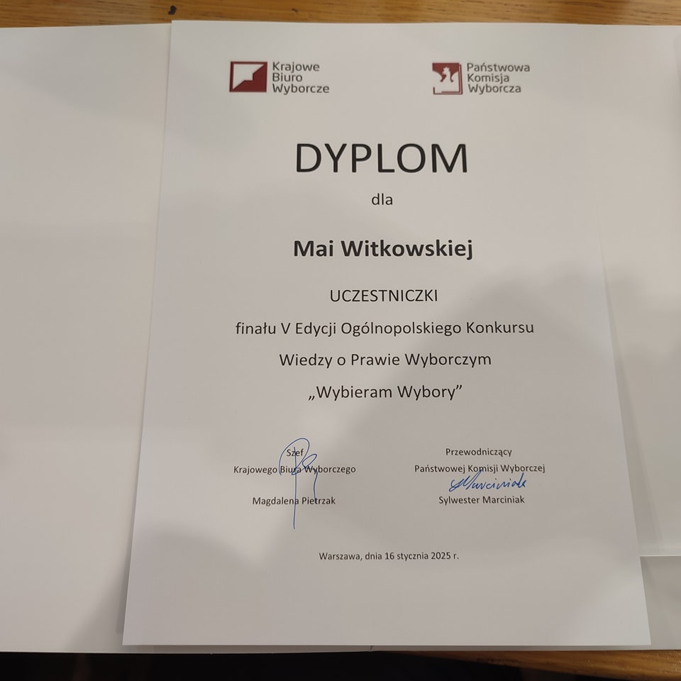 - Wielkie gratulacje dla Mai Witkowskiej! Uczennica klasy 3B awansowała do trzeciego, najwyższego etapu V edycji Ogólnopolskiego Konkursu "Wybieram wybory", zorganizowanego przez Państwową Komisję Wyborczą oraz Krajowe Biuro Wyborcze. Musiała wykazać się bardzo dobrą znajomością kodeksu wyborczego i dlatego znalazła się w gronie 18 laureatów z całej Polski (w samym konkursie uczestniczyło 2053 uczniów z 270 szkół ponadpodstawowych z całego kraju).