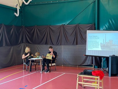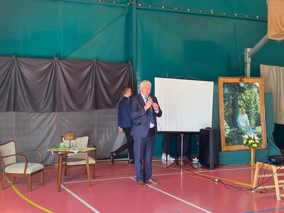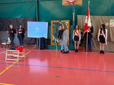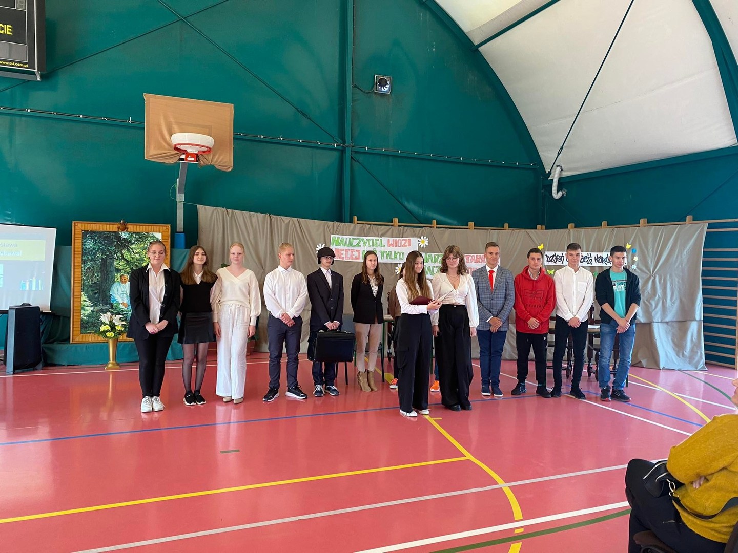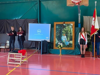 Przy tej okazji nie mogło zabraknąć życzeń dla grona pedagogicznego i wszystkich pracowników oświaty ze strony Samorządu Uczniowskiego, reprezentowanego przez Mikołaja Walasa jako przewodniczącego i Zofii Salickiej jako wiceprzewodniczącej. Pod obrazem patrona złożyli również okolicznościowy bukiet z biało-żółtych kwiatów. Szczególnie urzekły lilie!