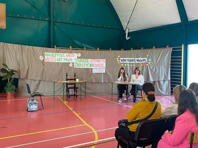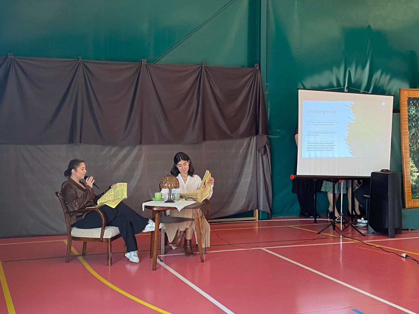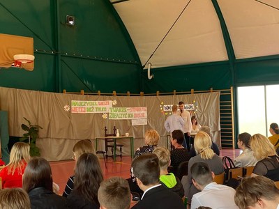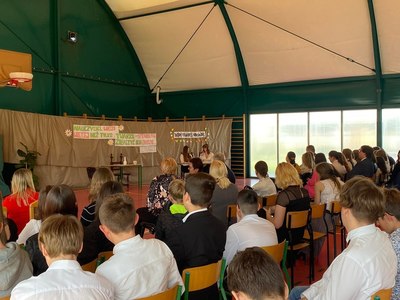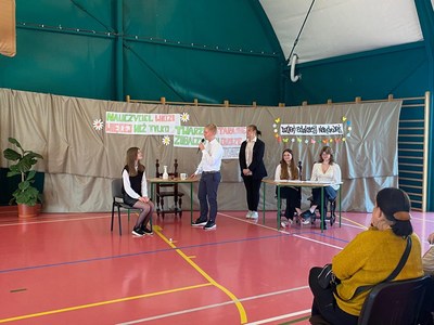 Młodzież klasy 4SP pod pieczą p. prof. Joanny Gonickiej przygotowała krótki spektakl o patronie. Przypomniane zostały najważniejsze wydarzenia z życia papieża – Polaka jak i anegdoty z życia Karola Wojtyły. Zaś podopieczni p. prof. Emilii Helik wykonali przedstawienie z okazji dnia nauczyciela w bardzo humorystycznym ujęciu. Śmiechom na Sali nie było końca.
