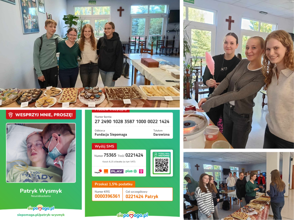 Dnia 1 października 2024 roku Szkolny Klub Wolontariatu zorganizował akcję charytatywną na rzecz Patryka Wysmyka, osiemnastolatka z Piotrkowa Trybunalskiego, który choruje na nowotwór. Młodzież naszego liceum zgromadziła kwotę 1400 zł, która została przelana na konto Fundacji Siepomaga, organizatora zbiórki. Celem zbiórki jest zagraniczne leczenie onkologiczne, które jest niestety bardzo drogie. Opiekun klubu wolontariatu składa serdeczne podziękowania wolontariuszom za przygotowanie wypieków, przekąsek i loterii fantowej, a całej społeczności szkolnej za hojność i dobre serce. Patrykowi życzmy szybkiego powrotu do zdrowia.