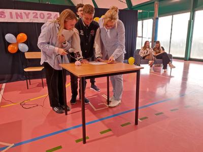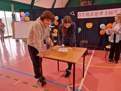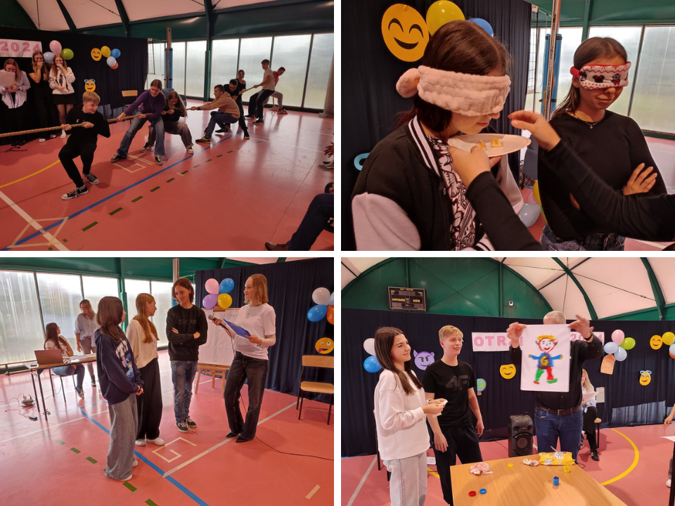 W dniu 30 października 2024 r. miały miejsce w naszej szkole otrzęsiny dla klasy pierwszej połączone z zabawą integracyjną dla całej licealnej społeczności. Młodzież musiała zmierzyć się z szeregiem wyzwań zarówno dotyczących wiedzy o samej szkole, wykazać się znajomością utworów muzycznych, ale i wziąć udział w grach wymagających szybkości, sprytu oraz kreatywności. Z pozytywnym odzewem spotkała się rywalizacja polegająca na przeciąganiu liny, co już wpisało się w tradycję obchodów otrzęsin w naszym liceum. Z niemałą cierpliwością oczekiwano efektów namalowania portretu pana Dyrektora. Finalne impresje przerosły oczekiwania wszystkich.